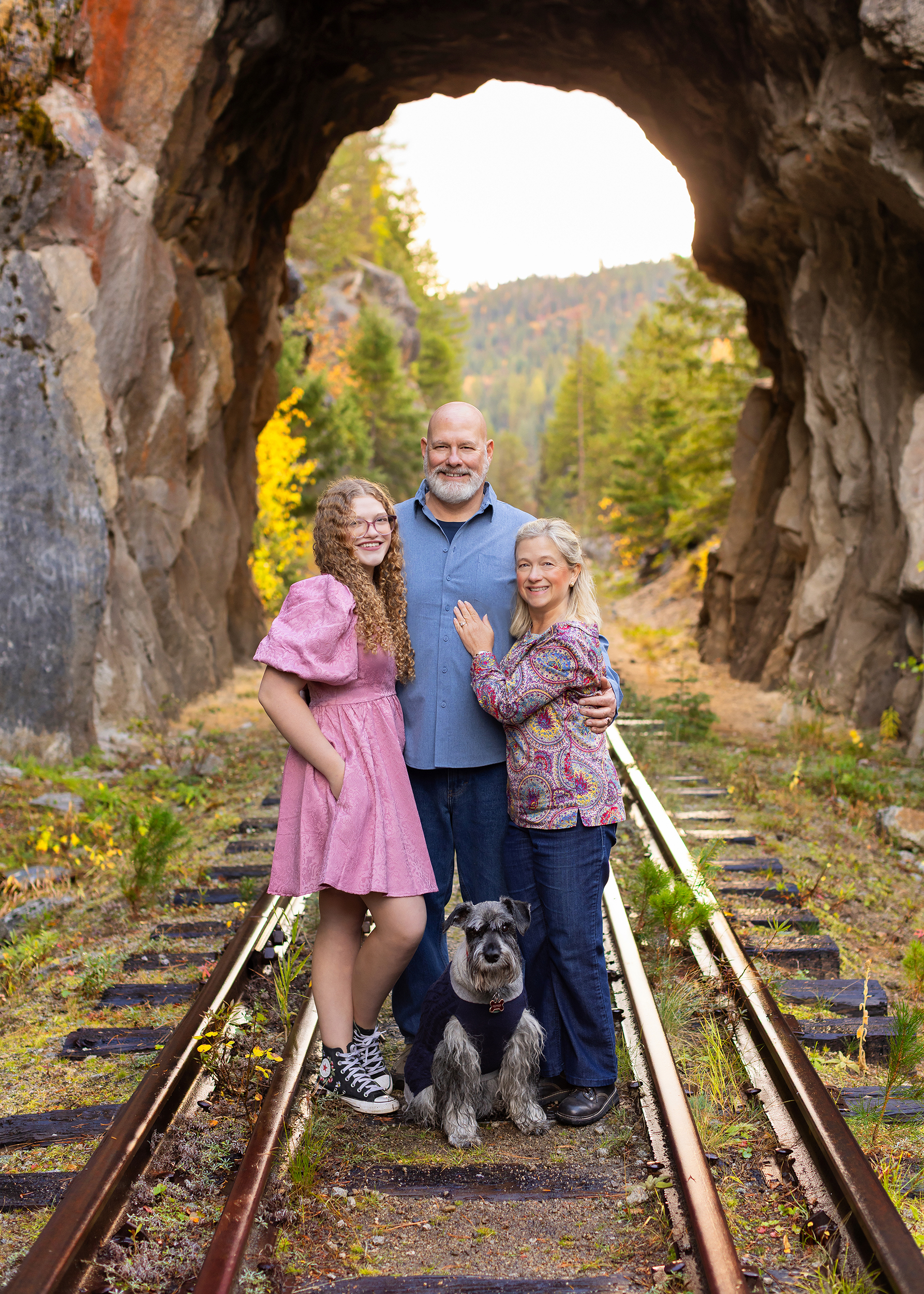 Cue the very angry clouds ☁️⛈️—we hustled to our next spot and made it to the tunnel just in time for a full-on downpour. Idaho weather doing what it does best! But just as quickly, the clouds parted and gave us the dreamiest light for more stunning portraits, family photos, and yes—even the pup joined in 🐶💕